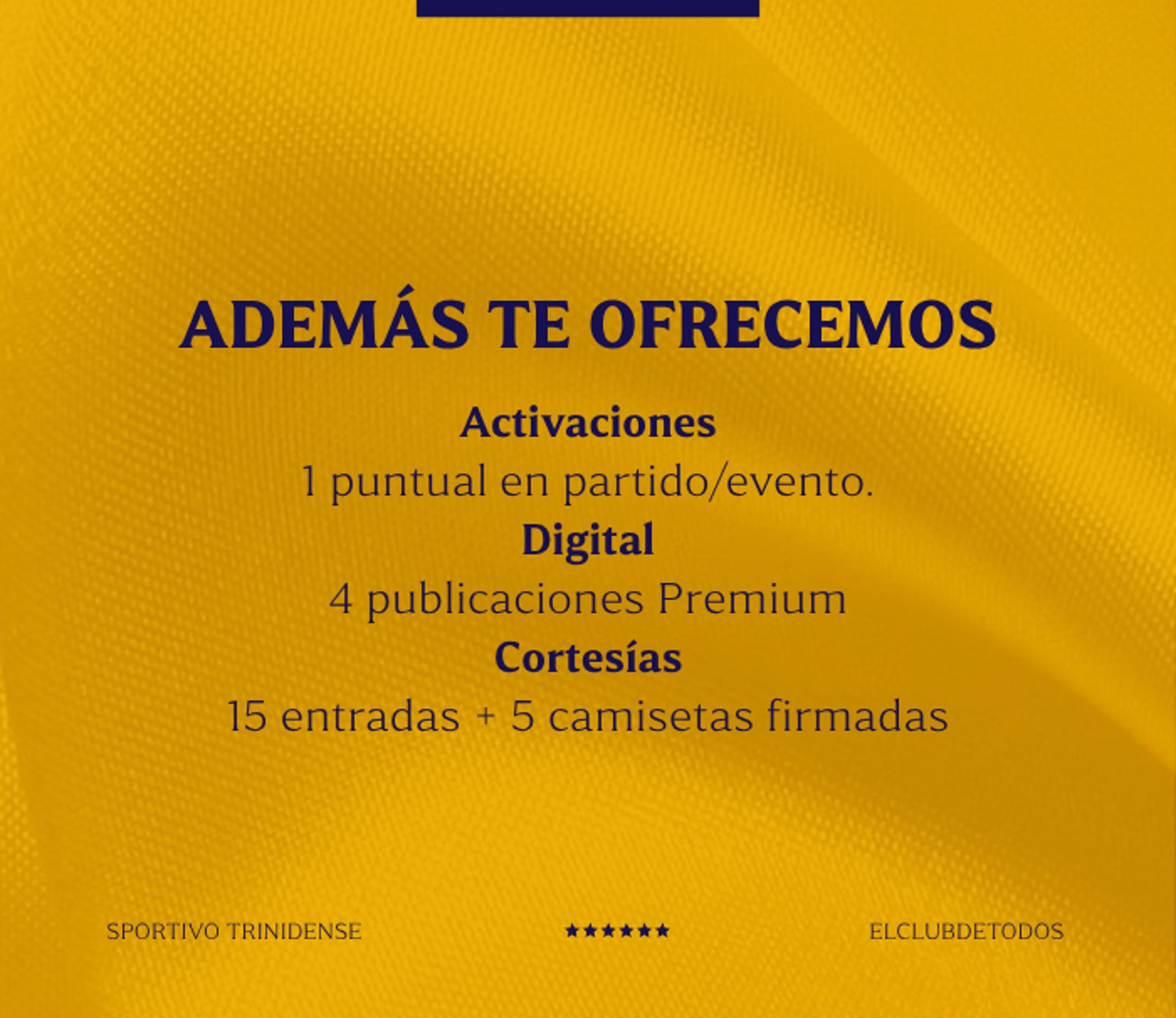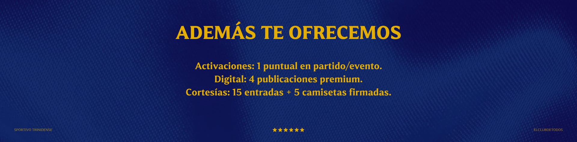 El Plan Plata ofrece visibilidad destacada en la parte posterior de la camiseta, ocupando posiciones estratégicas en la espalda alta y/o espalda baja principal. Una oportunidad accesible para marcas que desean integrar su imagen al movimiento del equipo, con presencia permanente en registros fotográficos, coberturas deportivas y contenido institucional.